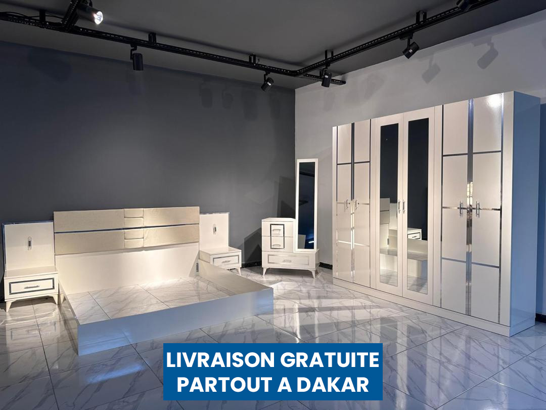 Dimensions • Armoire : 220 x 240 x 50 cm • Coiffeuse : 90 x 80 x 41 cm • Lit : 180 x 200 cm • Chevets : 40 x 50 cm Chambre à coucher avec armoire 6 battants / Coiffeuse et 2 Chevets Un espace raffiné, pensé pour le bien-être et l’harmonie.” “Élégance et confort réunis. Nos chambres à coucher importées offrent un design sophistiqué, des lignes épurées et une qualité irréprochable.