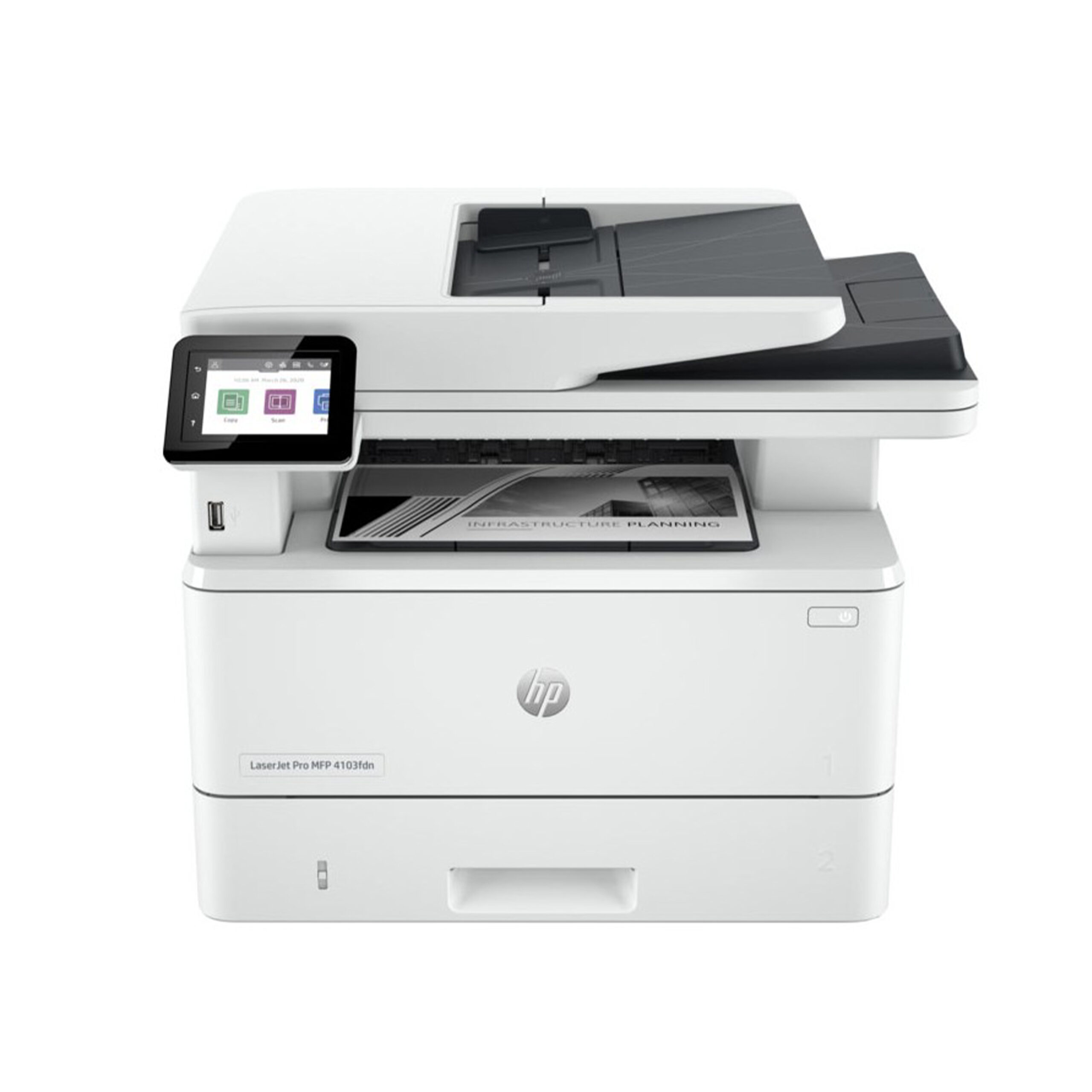 Imprimante Multifonction HP Laser Pro 4103fdw Impression, copie, scan, fax Vitesse d’impression noir: 40 pages par minute (norme ISO) Qualité d’impression noire: Lignes fines (1 200 x 1 200 ppp) Volume de pages mensuel recommandé: 750 à 4 000 (HP recommande un nombre de pages imprimées mensuelles dans la fourchette indiquée afin d’optimiser les performances du dispositif, en fonction de facteurs incluant les intervalles de remplacement des consommables et la durée de vie du dispositif durant la période de garantie étendue.) Impression recto/verso: Automatique Fonctionne avec: 1 (noir) Connectivité: WI-FI avec Bluetooth; 1 port USB 2.0 haut débit ; 1 port hôte USB à l’arrière; 1 port USB à l’avant; Réseau Gigabit Ethernet LAN 10/100/1000 BASE-T Encres fournies avec l’imprimante: Toner noir HP LaserJet authentique préinstallé